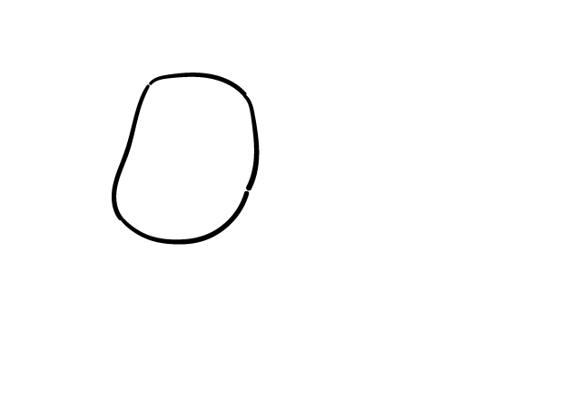 顔の輪郭の下側に、弧を描くように線を引いて、その中に小さな楕円を2つ描きます。